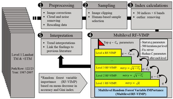 According to Figure 5, the system involves five steps. (1) The raw satellite images were corrected using the methods explained in Section 2.1, and then the corrected data were normalized into the range of [0, 1]. Although the random forest algorithm does not require transformed data, the rescaling can prevent numerical problems in the calculation and visualization of the result; (2) The samples were manually selected based on the high-severity area, as outlined in Section 2.1; (3) After evaluating spectral indices, we examined the box plot of each spectral index to detect and remove outliers (e.g., null data or very high and low value) caused by noise remaining in the corrected data; (4) The final samples were set as inputs to the multilevel RF-VIMP (Section 2.2.2); (5) The results from multilevel RF-VIMP were interpreted to examine the framework’s performance (Section 3 and Section 4).