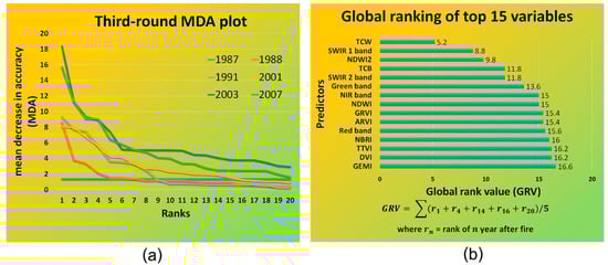 The average cumulative ranks were obtained from 500 iterations in third-round RF-VIMP, and the top 10 predictive parameters are presented in Table 2 and Figure 6. The results based on both MDA and MDG (Table 2) consistently suggest that SWIR1 (1.55–1.75 μm) and SWIR2 (2.08–2.35 μm) were the key predictive indicator for forest recovery in the study area, as they usually ranked in the high rank for all observation years. Almost all parameters achieved identical MDA in the year of the fire (1987) (Figure 6a, Table 3), because burnt and healthy forest were easy to separate. However, there are six indices (green band, MNDWI, SWIR1, TCB, TCW, VARI, and VIgreen) that received a 0 value that are not shown in the results for either MDA or MDG, representing a low discriminative ability when competing to the other predictors. Based on the RF-VIMP, one year after fire, the NBRI was the most predictive index. Moreover, NIR and SWIR2 alternated in terms of being ranked first from 4 to 16 years after the fire.