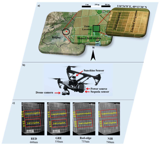 The site of field trial was (40°13′30″ N, 116°34′0″ E) Shunyi Experimental Station of the Chinese Academy of Agricultural Sciences (CAAS), Beijing (Figure 1a). A randomized complete block design with three replications was employed. Each plot consisted of 7.5 m six rows, 1.2 m in width, and with 0.2 m inter-row spacing. The trials were planted 23 October 2017 with a seedling rate of 270 seedlings/m2 and harvested on 13 June 2018. The limited irrigation treatment was restricted to flooding after seedling and tillering, whereas full irrigation treatment was continued to further irrigation at the stem elongation and early grain filling stages at levels of 2250 to 2700 m3 ha−1. Nutrient levels for both treatments were maintained at the optimal level. Seasonal precipitation was 128 mm from planting to harvesting. Each plot was harvested by combine harvester after full maturity to estimate grain yield.