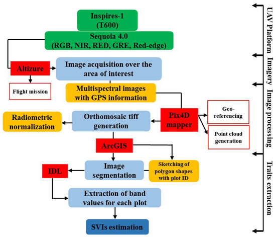 The main advantage of the Sequoia sensor is that it captures multispectral images with accurate geo-reference information, which is important to achieve precise point clouds for good quality orthomosaic generation. Pix4D mapper (Version 1.4, PIX4d, Lausanne, Switzerland) (https://pix4d.com/) was used for orthomosaic generation after each aerial photoshoot of the experimental area. The key steps of the orthomosaic generation using Pix4D mapper comprised camera alignment, geo-referencing, building dense point cloud, generating DSM and orthomosaic as previously reported in some studies [29,30,31]. Moreover, Pix4D mapper have ability to compute accurate GCPs after matching the mutual tie points positions of images capture from camera automatically to minimize the error probability in orthomosaic generation. Data acquisition from UAV platform to image processing for extraction of band values is elaborated in Figure 2. ArcMap scripted in ArcGIS (Version 10.3.1 Esri, USA) (http://www.esri.com/arcgis/about-arcgis) was used for image segmentation to extract the useful information of each plot. For this, polygon shapes were generated with a specific plot ID defining the particular germplasm [31]. Spectral values were analyzed using combined orthomosaic TIFF images of four different bands and polygon shape files in IDL (Version 8.6, Harris, Geospatial Solutions, Inc. Reston, CO, USA). Reflectance calibration was done using calibrated reflectance panel with known reflectance values provided by Micasense (Micasense Parrot, Seattle, WA, USA).
