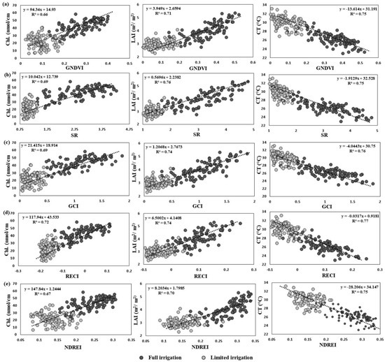 Linear regressions among spectral vegetative indices (SVIs); (a) green normalized difference vegetation index (GNVDI); (b) simple ratio (SR); (c) green chlorophyll index (GCI); (d) red-edge chlorophyll index (RECI); (e) normalized difference red-edge index (NDREI) and corresponding physiological traits derived from UAV multispectral imagery at mid to late grain filling stage and ground-based sensors under two irrigation treatments. GNDVI, green normalized difference vegetation index; SR, simple ratio; GCI, green chlorophyll index; RECI, red-edge chlorophyll index; NDREI, normalized difference red-edge index; Chl., chlorophyll; LAI, leaf area index; CT, canopy temperature.