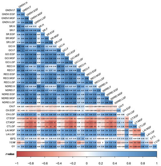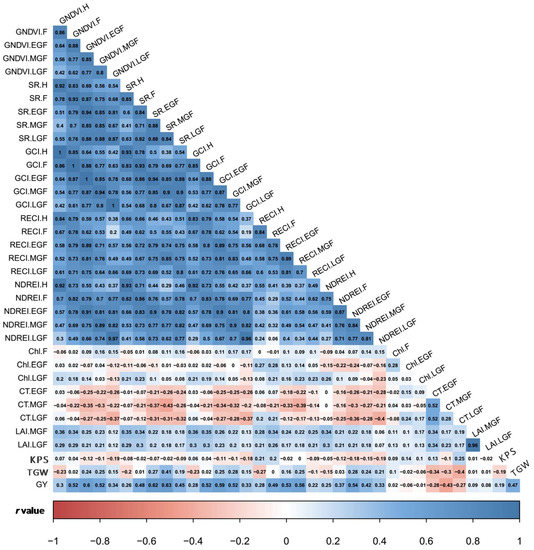 Correlation coefficients among SVIs, and physiological and yield traits obtained under full irrigation treatment from heading to late grain filling at p ≤ 0.05. Intensity of two colours indicate the strength of both positive and negative r values. H, heading; F, flowering; EGF, early grain filling; MGF, mid grain filling; LGF, late grain filling; GNDVI, green normalized difference vegetation index; SR, simple ratio; GCI, green chlorophyll index; RECI, red-edge chlorophyll index; NDREI, normalized difference red-edge index; Chl., chlorophyll; LAI, leaf area index; CT, canopy temperature; KPS, kernels per spike; TGW, thousand grain weight; GY, grain yield.