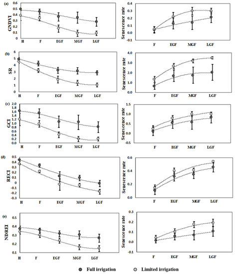 SVIs on word from heading stage and senescence rate calculated from each SVI under two irrigation treatments. (a–e) illustrate declines in GNDVI, SR, GCI, RECI and NDREI after heading and senescence rates estimated from the SVIs values at four-time points under two treatments. For abbreviations see footnote of Figure 4. Measurements were made 10 days earlier in limited irrigation treatment.