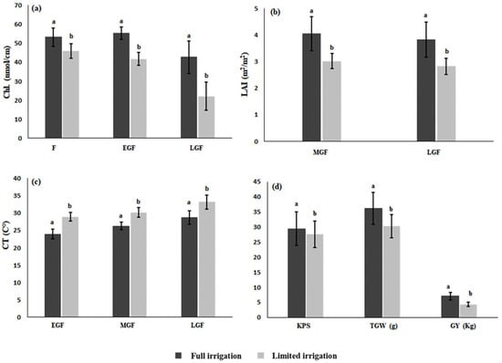 Measurements of physiological attributes: Chl. (a), LAI (b), CT (c) and yield (d) under full and limited irrigation conditions. Alphabets indicate difference between two treatments and error bars show standard deviation of mean data from 32 genotypes. For abbreviations see footnote of Figure 4.