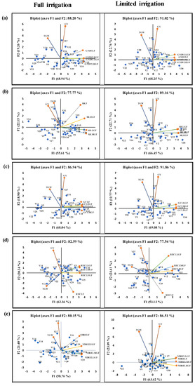 Biplots results from principle component analysis (PCA) of senescence rate calculated from SVIs and yield traits under both irrigation treatments. Sub figures (a–e) illustrate the PCA for GNDVI, SR, GCI, RECI and NDREI derived senescence rates, respectively, under two treatments. Different color lines represent the variables and blue circles for genotypes. For abbreviations see footnote of Figure 4.