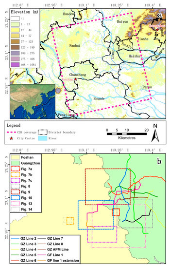 This study aims to investigate the deformation in Guangzhou and Foshan between 2011 and 2017 using X-band COSMO-SkyMed (CSK) SAR data, which can provide much higher resolution than the C-band Envisat and L-band ALOS satellites previously used in the region. More importantly, the previous studies focused on the subsidence period between 2006 and 2011, the comprehensive subsidence phenomenon at Guangzhou and Foshan is not known after 2011. It is worth noting that significant developments in the subway system in Foshan and Guangzhou have been implemented since 2011. Foshan and Guangzhou have up to 10 metro lines covering a total length of 309 km and 167 stations as of August 2017, which is a large jump from the length of 250.8 km and 153 stations at the end of 2011. The subsidence is one aspect connected to the rapid urban development in Guangzhou and Foshan, which may lead to serious economic loss and threaten human life. Hence, up-to-date subsidence information is very important because it is useful for assessing the risk of subsidence-related incidents that may occur in the near future.