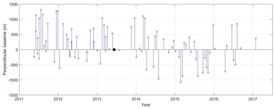 In this study, we analysed 86 X-band CSK HIMAGE SAR images in stripmap mode collected from 20 May 2011 to 27 January 2017 over the study area. The CSK images are acquired in ascending orbits with spatial resolution of 3 m in both range and azimuth. Based on previous studies [4,26], most of the surface deformation in the study area are expected to be focused on relatively small areas with a radius of a few kilometres and with a magnitude of the deformation of less than ~20 mm/year. Another focus of this paper is to study the urban areas of Guangzhou and Foshan where the temporal decorrelation is not an issue compared to areas with dense vegetation cover. X-band SAR products, which are sensitive to small deformations, are, hence, the preferred choice rather than C-band and L-band SAR data. The reference image acquired on 9 June 2013 was chosen as it minimises the perpendicular and temporal baselines of the series of interferograms (Figure 2). The perpendicular baseline varies between −1069 m and 1317 m and the time-period of observations spans 2079 days (approximately 5.7 years).