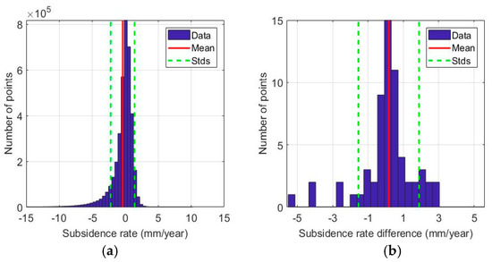 The CSK measurements are compared to the ENVISAT measurements, which were generated based on 19 ENVISAT ASAR images acquired between 2006 and 2009 [26]. Since the spatial resolution of CSK and ENVISAT data is different, the CSK result is resampled at the same grid spacing as the ENVISAT result for comparison. The comparison procedure here is similar to the approach used for the levelling data. The reference point is selected in the same area (Figure 3), but a grid with a spatial resolution of 90 m × 90 m is used instead. There are 106,511 common points after the above procedure. Figure 7 shows a broad agreement between the CSK and ENVISAT subsidence rate maps with a mean subsidence difference of 0.1 mm/year and standard deviation of 1.8 mm/year between the two measurements.