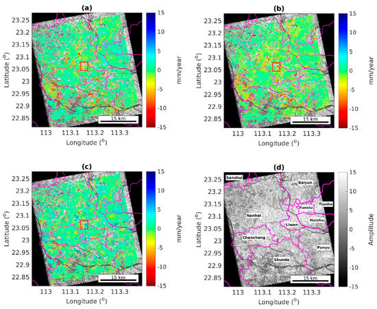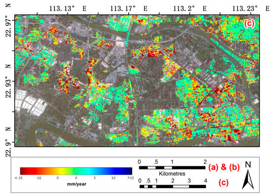 Figure 8 shows areas of subsidence that are possibly caused by groundwater exploitation. The rapidly deforming region in Figure 8a is located at Sanshan Yidong Industrial Zone at Nanhai District where subsidence rates of up to −23 mm/year are observed. The industrial zone is dense with factories of different types, including factories for moulds, toy, footwear, metalware, etc. These factories typically require large amount of water during the production cycle and it is, therefore, likely that the observed subsidence is related to groundwater pumping. Figure 8b shows subsidence over an ecological farm at Chancheng District with deformation rates of up to −30 mm/year around the farm. Since groundwater is commonly used for irrigation purposes, subsidence from groundwater exploitation is likely occurring in this area. The subsidence rate of Beijiao Township in the Northern Shunde District, is a well-known signal [26] (Figure 8c). The peak deformation rate observed here is −21 mm/year, which is only slightly lower than at the other two places. Although the deformation rate is lower, the spatial extent of the signal is the largest. Moreover, this region is a combination of agricultural, residential, and industrial developments. Considering many vegetated areas in this township where no measurement points could be obtained, it can be concluded that the maximum subsidence rate could be many times larger than the reported here. Possible causes of the subsidence in Beijiao include groundwater extraction, lack of bearing capacity in the buildings foundations, and the unstable geological conditions.