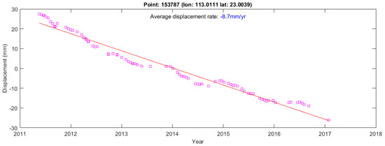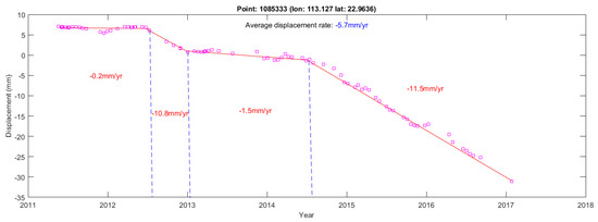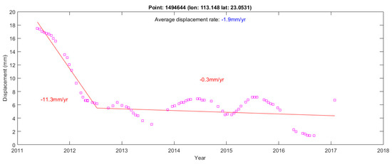 Two separate TS-InSAR analyses are conducted using the CSK images acquired between 2011 and 2013 (45 images), and those acquired from 2013 to 2017 (42 images). The two results are compared to investigate the temporal behaviour of the subsidence in Guangzhou and Foshan. The subsidence rate maps for the first and second sets are shown in Figure 5. The results show that the displacement pattern and magnitude of the three displacement maps (2011–2017, 2011–2013, and 2013–2017) are in broad agreement. However, a number of areas, which appears to deform at different rates, are observed, including areas such as the centre and southern part of Nanhai district, the western part of Chancheng district, the northern part of Shunde district, and the southwest part of Haizhu. For example, the southern part of Nanhai district at Foshan appears to be deforming in Figure 5a, but it is relatively stable in Figure 5b. Figure 6 shows the deformation time series of a point in this area. Rapid deformation, over −11.3 mm/year, occurred between 2011 and mid-2012, but waned after mid-2012, suggesting that such an area is not affected by stable, linear subsidence (see discussion for further detail). Interestingly, the temporal variation of displacement rates observed in regions characterised by subsidence may be the result of the rapid urban developments and sudden, episodic changes in the groundwater level.