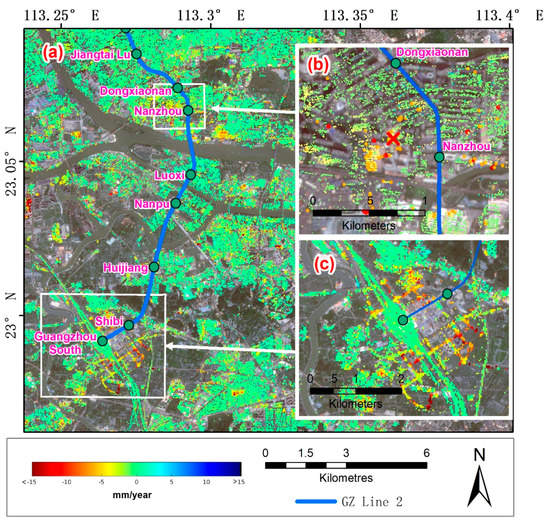 InSAR-measured displacement rate map between 2011 and 2017 over (a) south part of GZ Line 2; (b) Nanzhou station; (c) near Guangzhou South Railway station. The blue line represents the GZ Line 2 and the red cross in (b) represents the location of subsidence incident reported. The background images are the Sentinel-2 true colour images acquired on 1 November 2017.