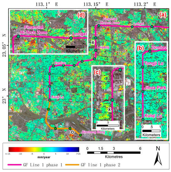 InSAR-measured displacement rate map between 2011 and 2017 over (a) GF Line 1 (west part); (b) the section from Zumiao station to Kuiqi Lu station; (c) the section from Financial Hi-Tech Zone station to Leigang station; and (d) the section from Longxi station to Financial Hi-Tech Zone station. The purple line represents the GF Line 1 phase 1 and the orange line represents the GF line 1 phase 2 (i.e., extension of phase 1).