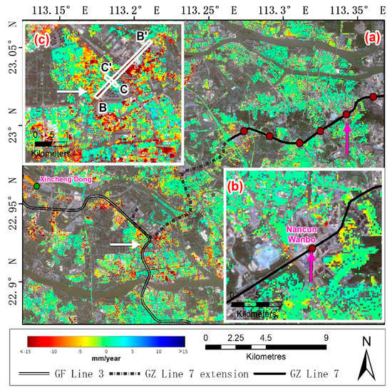 InSAR-measured displacement rate map (2011–2017) of (a) GZ Line 7, GZ Line 7 extension (under construction) and GF Line 3 (under construction); (b) Nancun Wanbo station; and (c) two subway lines under construction. The background images are the Sentinel-2 true colour images acquired on 1 November 2017. The white boxes in (c) indicate the location of the profile lines B–B’ and C–C’.