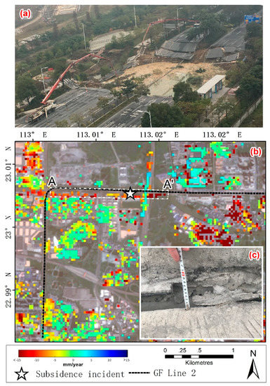 (a) The field investigation photo for the subsidence incident; (b) the InSAR-measured displacement rate map (2011–2017) of GZ Line 2 (under construction); and (c) the field investigation photo near the location of the incident. The white star represents the location of the Jihua Xi road subsidence incident. The box with white broken line in (b) indicates the location of the profile lines A–A’.