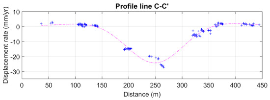Several areas that are potentially at risk are identified based on the subsidence characteristic for GF Line 2. For example, the two subway lines, GZ Line 7 extension and GF Line 3, which pass through the Beijiao Township were under construction as the time the manuscript was prepared (construction began in mid to late 2016). It can be seen in Figure 13a that both subway lines pass through a number of deformation zones where some of them are deforming with a rate of over −20 mm/year. The sections of two subway lines that follow the National Highway Beijing Zhuhai line (highlighted by the white arrow in Figure 13c) are experiencing rapid deformation. These are similar to the case of GF Line 2, where continuous subsidence occurred before the subway construction started. Hence, surface loading from highway vehicles is expected to be one of the main factors causing subsidence. The profile lines in longitudinal (B–B’) and transverse directions (C–C’) near Nan Yuan road on the National Highway Beijing Zhuhai line (white boxes in Figure 13c) are shown in Figure 17 and Figure 18. The observed subsidence rate along the longitudinal direction is over −10 mm/year in most area with a peak subsidence approaching −30 mm/year. In addition, the area affected by subsidence along the transverse direction is roughly 200 m wide. Although similar subsidence characteristics were reported between these subway lines, there are many more high-rise buildings near Nan Yuan road. Therefore, greater loss is expected if a sinkhole would form in these areas. Continuous monitoring in this area is, therefore, very important to minimise the risk of ground collapse during or after the underground excavation work.