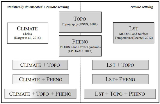 - Feilhauer, H.; He, K.S.; Rocchini, D. Modeling Species Distribution Using Niche-Based Proxies Derived from Composite Bioclimatic Variables and MODIS NDVI. Remote Sens. 2012, 4, 2057–2075. [Google Scholar] [CrossRef]