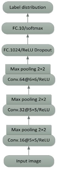 Actually, there is no consensus on how to design CNNs for the specific application of SAR ATR. In the previous works, several different kinds of CNNs have been applied to SAR ATR and they all achieved very good performances [,,,]. Based on these works, this paper designs the architecture of CNN as Figure 1, which is composed of three convolution layers, three max pooling layers, and two fully-connected layers. The convolution stride is fixed to 1 pixel with no spatial zero padding. After each convolution layer, a max pooling is performed with a kernel size of 2 × 2 and a stride of 2 pixels. The rectified linear units (ReLU) activation function is applied to every hidden convolution layer.