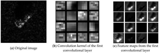 During the training of the designed networks, the weights are initialized from Gaussian distributions with zero mean and a standard deviation of 0.01, and biases are initialized with a small constant value of 0.1. The learning rate is initially 0.001, which decreases by a factor of 0.1 after 100 epochs. The batch size is set to be 100. To train the proposed CNN, the deep learning toolbox in Tensorflow is used. The cropped MSTAR training images (the detailed descriptions of the MSTAR dataset are presented in Section 5) are fed to the networks in Figure 1. The hierarchical features are learned during the training process. According to the target label of each training sample, the parameters of the whole networks are obtained. As shown in Figure 2, the total loss decreases sharply and converges after about 1500 epochs during the training. Figure 3 illustrates the original image and internal state of the trained CNN. In the first convolution layer, the convolution kernels and 16 feature maps are shown in Figure 3b,c, respectively. It is clearly that the global properties of the original image in Figure 3a can be maintained in the feature maps. Afterwards, in the classification stage, the cropped test image is input to the trained CNN to decide its target type.