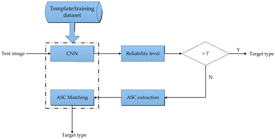 A threshold is used to judge whether the decision from CNN should be adopted. With a reliability level higher than the threshold, the decision is assumed to be highly reliable. Then, the target type is directly decided by CNN. Otherwise, the test sample is passed to the ASC matching for further identification. The template samples are selected based on the estimated azimuth of the test image []. Then, the target type is decided to be the class with the maximum similarity. The ASC matching makes detailed analysis about the local structures of the targets thus more robust to various EOCs. By hierarchically fusing the two classification schemes, both the efficiency and robustness of the ATR method can be enhanced.