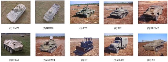 To experimentally evaluate the proposed method, the MSTAR dataset is used in this study, which is the benchmark dataset for SAR ATR. There are 10 military targets included in the dataset, which share similar appearances as shown in Figure 5. Their SAR images are captured by the X-band SAR sensors with the resolution of 0.3 m × 0.3 m. The training and test samples used for experiments are showcased in Table 3, which are collected at 17° and 15° depression angles, respectively.