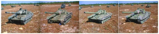 A certain military target may be modified to have several different configurations for different applications. The different configurations share similar target shapes with some local variations. Table 7 showcases the training and test sets for this experiment. The configurations of BMP2 and T72 for testing are not included in the training set. Figure 7 shows the optical images of four different configurations of T72. Several local differences can be found at the turret, fuel drums, etc. Table 8 lists the detailed recognition results of the proposed method under configuration variance. All the configurations of BMP2 and T72 can be classified with PCCs over 96%, resulting in an average of 98.64%. The performances of different methods are compared in Table 9. With the highest PCC, the proposed method is validated to be the most robust to configuration variance. It is also notable that the ASC method outperforms the remaining ones. In the ASC method, the one-to-one correspondence between the test and template ASC sets is built, which is beneficial to sense the local variations of the target caused by configuration variance. In the proposed method, some test samples can still be reliably classified using the designed CNN. The remaining ones can obtain more accurate decisions by ASC matching. Therefore, the final recognition performance of the proposed method can be effectively enhanced.