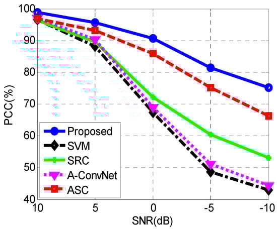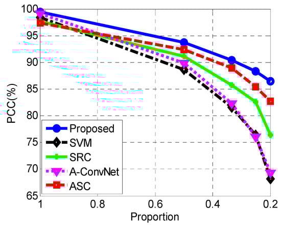 Actually, the available training resource for SAR ATR is quite limited [,]. As a result, the training samples may only cover a certain proportion of the full 360° azimuth range. For experimental evaluation, we randomly select 1/2, 1/3, 1/4, 1/5 and 1/6 from each of the 10-class samples and then perform target recognition based on the reduced training set. As shown in Figure 13, the proposed method keeps the highest PCC at each reduction level, validating its best robustness to limited training samples. In addition, ASC method shares an approaching performance to the proposal and outperforms the remaining ones significantly. For SVM, SRC and CNN, their performances are closely related to the completeness of the training set. When the training samples are reduced severely, their PCCs experience sharp decreases. In the ASC method, the corresponding templates are selected based on the azimuth of the test image. In fact, the ASCs can maintain stable in a certain azimuth interval (e.g., [−5°, 5°]) []. Then, the ASC matching can still be performed with good effectiveness. As a combination of CNN and ASC matching, the proposed method achieves the best performance mainly by inheriting the robustness of ASC matching.