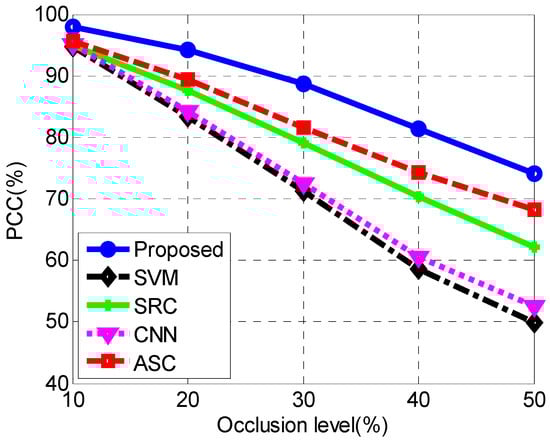 Figure 10 plots the average PCCs of different methods under noise corruption. In comparison, the proposed method has the best robustness to noise corruption with the highest PCCs at each SNR. The ASC method outperforms SVM, SRC, and CNN at SNRs lower than 5 dB. The reasons can be analyzed from two aspects. On one hand, the ASCs are noise-robust features. Then, the ASCs of noisy images can still be extracted with good precision to match well with those from the template samples. On the other hand, the local variations caused by noise corruption can be better handled via the one-to-one correspondence between two ASC sets. In the proposed method, the ASC matching method can effectively complement the designed CNN to cope with those severely corrupted samples. Therefore, the final performance is significantly improved.