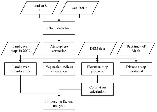The approach includes four main steps (Figure 2): (1) data pre-processing, including cloud detection, atmosphere correction, geometric correction, resampling, and mosaicking; (2) calculate vegetation indices, including NDVI, ΔNDVI, and NDVI%; (3) producing different kinds of influencing factors, including land cover, elevation, and distance; and (4) analysis of influencing factors of Hurricane Maria, using correlation coefficient and linear regression model. All steps are further described below.