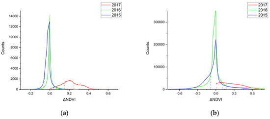 The histogram of ΔNDVI. (a) Dominica (ΔNDVI 2017: pre-hurricane: 09/09/2017, post-hurricane: 09/21/2017, ΔNDVI 2016: pre-hurricane: 09/18/2016, post-hurricane: 10/20/2016, ΔNDVI 2015: pre-hurricane: 09/16/2015, post-hurricane: 10/18/2015); (b) Puerto Rico (ΔNDVI 2017: pre-hurricane: 09/17/2017, post-hurricane: 10/03/2017, ΔNDVI 2016: pre-hurricane: 09/14/2016, post-hurricane: 10/16/2016, ΔNDVI 2015: pre-hurricane: 09/28/2015, post-hurricane: 10/14/2015).