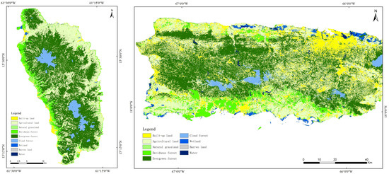Nine land cover classes, including built-up land, agricultural land, natural grassland, deciduous forest, evergreen forest, cloud forest, wetland, barren land, and water, were effectively distinguished and updated (Figure 5). A quantitative accuracy assessment was conducted for evaluating the accuracies of the 2017 land cover maps. Over 100 random samples were selected and classified using manual interpretation techniques based on Google Earth imagery of 2017. The overall accuracies for Dominica and Puerto Rico image classification were 92.49% and 89.92%, which indicating a strong agreement or accuracy between the classified images and reference data.