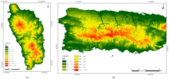 Elevation maps were divided using a natural breaks method based on DEM data. Natural break classes are based on natural groupings inherent in the data. Class breaks are identified that best group similar values, and that maximize the differences between classes. The features are divided into classes whose boundaries are set where there are relatively big differences in the data values [43]. The DEM surface of Dominica and Puerto Rico are divided into 10 classes using natural breaks method, respectively.