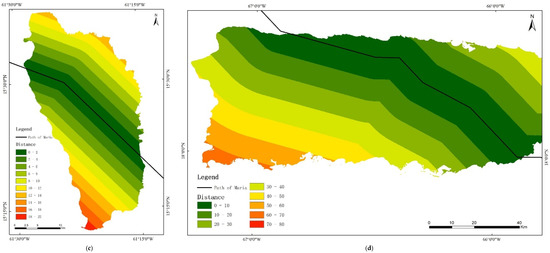 The distance map is produced based on the best track of Hurricane Maria using multiple ring buffer method [44]. We create 10 multiple buffers at specified distances from the best track line. Considering the area of islands, the specified distances value of Dominica and Puerto Rico are set to 2 km and 10 km, respectively.