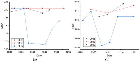 (1) NDVI is used to indicate the extent of vegetation destruction and provide information on damage severity. In early September 2017, there was a sudden drop in NDVI after Hurricane Maria’s landfall (Dominica: from 0.91 to 0.70, and Puerto Rico: from 0.75 to 0.56). Subsequently, there was an abnormal new leaf bloom and the vegetation recovered slowly. By November of 2017, the NDVI had reached nearly normal values (Dominica: 0.83, and Puerto Rico: 0.72) but was still slightly lower than in the previous years of 2015 (Dominica: 0.90; and Puerto Rico: 0.79) and 2016 (Dominica: 0.91, and Puerto Rico: 0.78). This remaining NDVI depression suggests that the vegetation had not fully recovered from hurricane damage. The lack of any NDVI drop in 2015 and 2016 verifies that the 2017 drop was, in fact, hurricane related.