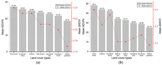 The mean NDVI% and ΔNDVI of different land cover types and their rankings. (a) Dominica; (b) Puerto Rico.