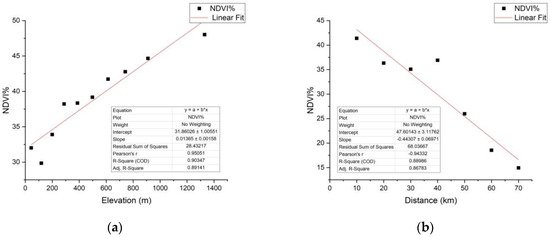 The linear regression results for Puerto Rico. (a) The strong positive relationship between mean NDVI% and elevation; (b) the strong negative relationship between mean NDVI% and distance.