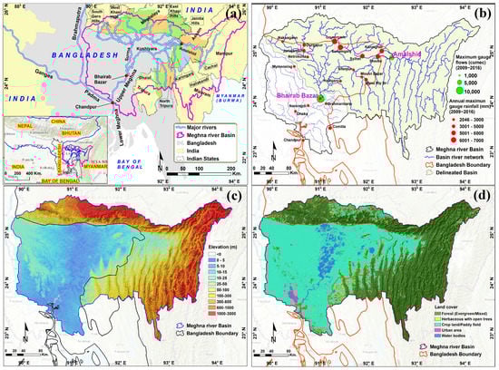 The Meghna (Upper Meghna) basin is a transboundary river basin and shares the area between Bangladesh and India (Figure 1a). It originates in the hills of Manipur and Meghalaya States in India. About 40% of the basin area falls within Bangladesh, and the remaining 60% lies in Indian territory. Specifically, the basin encompasses the mountainous Meghalaya, Assam, Manipur, Tripura, and Mizoram regions of India and the predominantly agricultural land of Bangladesh (22.75–26.00°N, 89.50–94.50°E) (Figure 1a,c,d). The topography of the basin changes rapidly in its northern and eastern areas, and the altitude varies from 1 to 2888 m with a mean of 362 m a.s.l. [29] (Figure 1c). The central part of the basin comprises plains and gentle hills and is, thus, highly vulnerable to flooding. The Barak River, which is the prime source of the Meghna River, bifurcates into the Surma and the Kushiyara Rivers at Amalshid, which is in Sylhet District near the Bangladesh-India border (Figure 1a). Discharges from the steep and highly flashy rivers originating in the Khasi and Jaintia Hills—which are the wettest places in the world, with an annual average rainfall of about 12,000 mm [4,30]—contribute to the Surma River through its right bank. On the other hand, the Kushiyara River receives water from the rivers that originate in the Tripura Hills (e.g., the Manu River). Between the Surma and Kushiyara rivers are many lowland regions, internal draining depressions (called Haors), meandering flood channels, and abandoned river courses, all of which are flooded in every pre-monsoon (flash-flood period) and monsoon season. The channels of the main rivers (e.g., the Surma, Kushiyara, Lubachara, and Jadukata), along with those of many other rivers in the basin, run from the northeast to the southwest and flow through the Bhairab Bazar stream gauge station as the Upper Meghna to join the Padma at Chandpur, and finally flows into the Bay of Bengal as the Lower Meghna (Figure 1a,b). The drainage area of the Upper Meghna is about 76,000 km2; about 62% of this area comprises forested, mountainous (or hilly) terrain, whereas 29% comprises irrigated cropland and pastures [31] (Figure 1d).