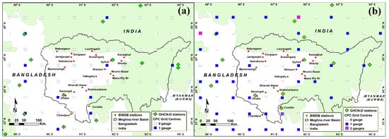 Meghna basin showing the GHCN-D global gauge stations and CPC unified 0.5°-grid centres that—along with other observed datasets—were used to produce the GSRP rainfall estimates on (a) 25 July 2010, and (b) 17 May 2016. The local 20 Bangladesh Water Development Board’s (BWDB) rainfall stations are also presented (red dots).