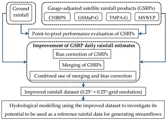 Figure 3 demonstrates the research method used in this study for the inter-comparison of four GSRPs, the creation of an improved rainfall dataset, and the investigation of that dataset’s applicability when simulating hydrological responses for the Meghna basin. First, the performance of the GSRPs is evaluated by comparing them to ground rainfall observations from the local gauges to identify the GSRPs’ further biases. Then, a number of bias-correction techniques are applied to re-correct the GSRP estimates. In addition to bias correction, three merging techniques are also investigated to improve the GSRPs’ performance. In addition, a combination of merging and bias correction is also explored. Among the bias-corrected and merged products, the product that provides the best results is selected as a reference rainfall dataset. Finally, the applicability of such dataset is investigated to the simulated streamflows using a distributed hydrological model.