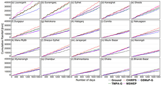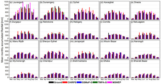 Cumulative rainfall of daily estimates calculated for the ground gauges and GSRPs throughout the wet season (March–October) of the study period (2009–2016), at 20 rain-gauge stations (a–t) located within the Bangladesh portion of the Meghna basin.