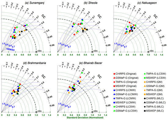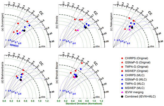 The overall performance of the improved products (both bias-corrected and merged) is evaluated using Taylor’s diagram [80], which summarizes the statistical differences between the time series of ground rainfall and the satellite estimate. The diagram concludes how fair the satellite-based rainfall estimates relate to the gauge estimates in terms of three statistical indicators: normalized root mean square difference (NRMSD), series normalized standard deviation (NSD), and correlation coefficient (CC). This diagram is useful for summarizing the statistical-error performances in a single 2D plot.