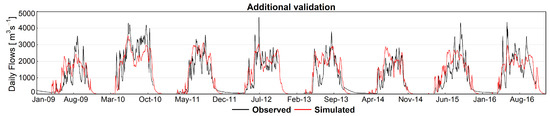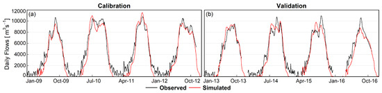 Using the calibrated model parameters, the validation of the RRI model is also performed by generating streamflows with the improved dataset for the latter half of the study period (from 2013 to 2016). The results are then compared with the observed streamflows at Bhairab Bazar station. In addition, an additional validation of the RRI model is also conducted by comparing the observed streamflows with those of the model for the Amalshid stream gauge station (the Meghna River’s prime entrance point into Bangladesh from India) for the entire study period (2009–2016). This allows for a further check of the model’s performance and of the potential for the rainfall dataset to be used when simulating flood flows inbound from India.