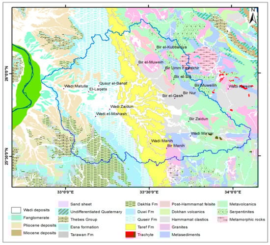 - EGSM. Geological Map of Eastern Desert, Egypt. Scale 1:500,000; The Egyptian General Petroleum Corporation: Cairo, Egypt, 1987. [Google Scholar]