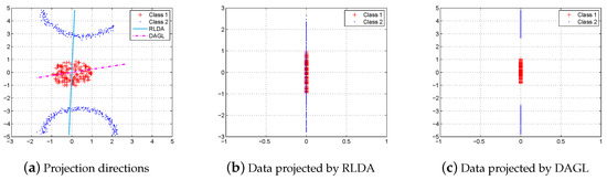 (a) Projection directions found by RLDA and DAGL; (b) one-dimensional data projected by RLDA; (c) one-dimensional data projected by DAGL. For a better illustration, the projected data is plotted in the plane coordinate system, and the horizon coordinate of the projected data is set as zero.