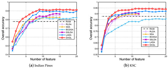 The curves of OA versus the reduced dimensionality on different datasets are shown in Figure 2. The proposed DAGL achieves the highest OA constantly. Especially, on the Indian Pines dataset, DAGL exceeds the second best one to a large extent when the reduced dimensionality is less than 4. In Figure 2, the performance becomes stable when the dimensionality increases to a certain value. This phenomenon implies that a low-dimensional subspace is sufficient for sustaining the valuable information. Compared with RAW, the performance with projected data is better in most cases, which validates that dimensionality reduction does improve the classification accuracy.