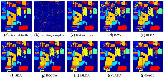 Competitors: for a quantitative comparison, six dimensionality reduction algorithms are taken as competitors, including regularized LDA (RLDA) [18], Semi-supervised Discriminant Analysis (SDA) [20], Block Collaborative Graph-based Discriminant Analysis (BCGDA) [25], Spectral-Spatial LDA (SSLDA) [21], and Locality Adaptive Discriminant Analysis (LADA) [22]. To demonstrate the usefulness of dimensionality reduction, the classification result with all features is taken as the baseline, known as RAW.