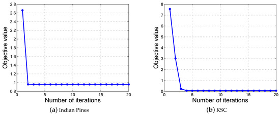 The convergence behavior of the proposed optimization algorithm is studied experimentally. We randomly choose two test samples from the Indian Pines and KSC datasets, and plot the changes of the objective values during the optimization. From Figure 5, we can see that the objective values of problem (11) converge within five iterations, which verifies that the optimization algorithm is effective and efficient.