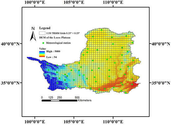 In this study, the Loess Plateau was divided into 1150 grids based on the 0.25° spatial resolution (Figure 1). The observed monthly and daily precipitation data during the period of 1998–2014, collected from the 50 meteorological stations in the Loess Plateau were used to evaluate the accuracy of the TRMM 3B43 precipitation data. Before evaluation, the 1150 calculation grids in the Loess Plateau were firstly encoded with consecutive numbers. If the meteorological station is located at a grid, the TRMM 3B43 precipitation data of this grid are compared with the data of the meteorological station. To show the locations of the 50 meteorological stations, we superimposed the grid structure on the map of the Loess Plateau (Figure 1).