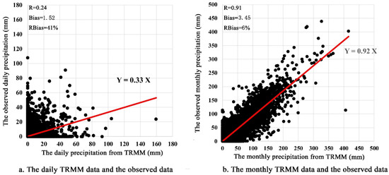 Figure 2 shows the comparison results of the observed and the TRMM 3B43 precipitation data of daily and monthly precipitation from 1998 to 2014.