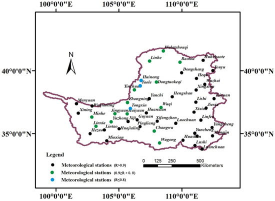Figure 2a shows the comparison of the daily precipitation from the two data sources. The Pearson correlation coefficient is 0.24, which is less than 0.5. The Bias is 1.52 and the relative Bias is 41%. This indicates that the accuracy of daily TRMM precipitation is poor which may be due to the complex topography and overlying surface conditions of the Loess Plateau. Figure 2b shows the comparison of the monthly TRMM precipitation. As shown in Figure 2b, the linear fitting equation between the monthly TRMM data and the observed data is . The Pearson correlation coefficient for monthly precipitation is 0.91 and the Bias is 3.45 and the relative Bias is 6%. To describe the spatial variability of TRMM monthly precipitation product accuracy, the results of the comparative analysis of precipitation data for each meteorological station and TRMM precipitation products are listed in Table 3, and the location of each meteorological station is given in Figure 3. Table 3 shows the comparison results between the observed and TRMM values of monthly precipitation from 1998 to 2014 for 50 meteorological stations. The R values of more than 35 meteorological stations are above 0.9 and the RBias values of more than 32 meteorological stations are less than 0.1. Therefore, the monthly TRMM precipitation data are satisfactory in accuracy. Overall, the monthly TRMM precipitation is more accurate than the daily precipitation. In this study, the calculation of the SPI drought index only needs monthly precipitation data. Consequently, the monthly TRMM precipitation data can meet the input data requirement of this study.