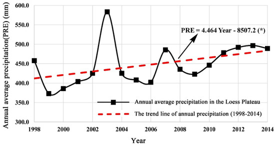 As shown as Figure 10, there are four drought years and four humid years during 1998–2014. The drought years are 1999, 2000, 2001 and 2005, while the humid years are 2003, 2007, 2012 and 2014. The drought years all occurred in the first half of 1998–2014 and most of the humid years occurred in the last half of 1998–2014 except the year of 2003. From the Figure 10, we find that occurrence rate of drought year is decreasing and the occurrence rate of humid year is increasing. Therefore, the Loess Plateau is most likely changing to be humid during 1998–2014.